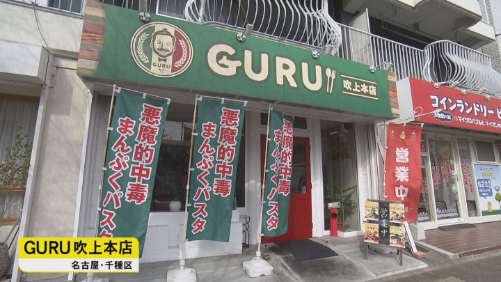 名古屋市千種区にあるパスタ専門店「GURU(ぐる)」。店先ののぼりには、「悪魔的中毒まんぷくパスタ」の文字が掲げられています。
