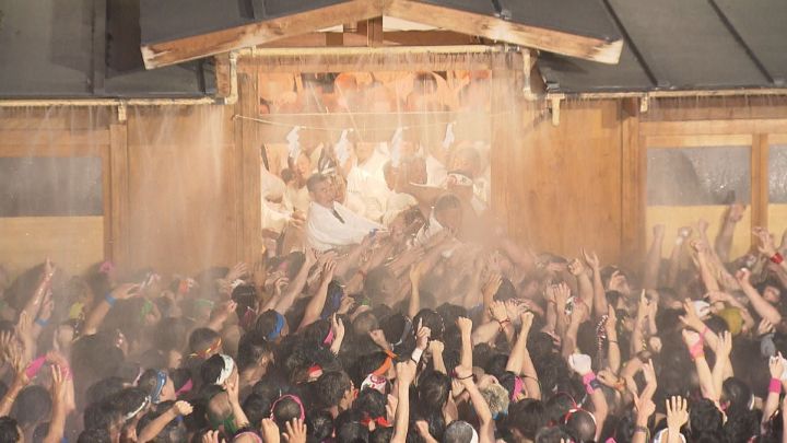 手桶隊がまく水は、参加者同士の摩擦によるケガや脱水症状を防ぐ、まさに命の水。その冷たさで裸男たちがひるんだ隙に、神男は少しずつ前進します。