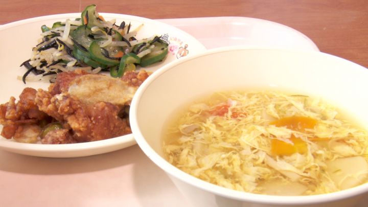 この日のメニューは鶏肉たっぷりの“チキンチキンごぼう”に、かきたま汁です。