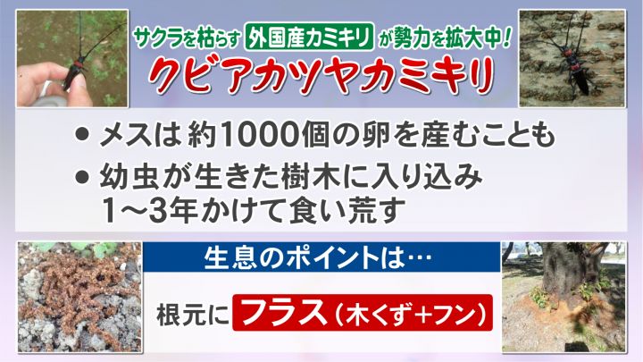 愛知県庁では、クビアカツヤカミキリを見つけたら「叩き潰すなどして駆除を。潰すのに抵抗がある方は、市販の殺虫剤をご使用ください」と、また名古屋市は「なごや生物多様性センター」に連絡するよう呼び掛けています。