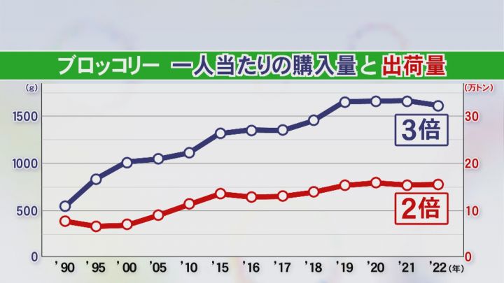 農水省によると、1990年からの30年で、ブロッコリーの1人当たりの購入量は3倍、出荷量は2倍に急増していて、まさに生活に欠かせない野菜になっています。