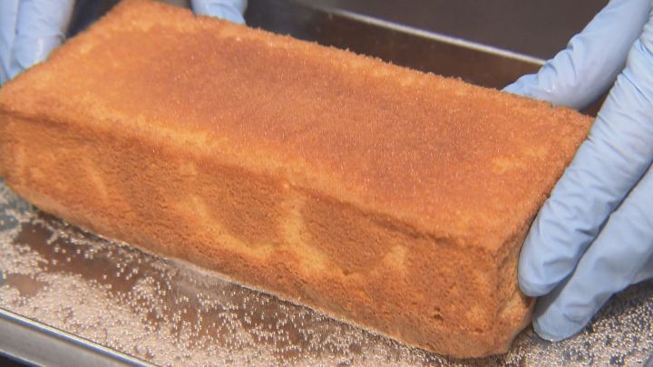 作り方は、ルテイン卵・小麦粉・牛乳などを混ぜて型に流し込み、約30分焼き上げてスポンジケーキが完成。そしてドンペリを容器に入れて、ケーキを浸していきます。