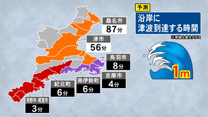 熊野市に加え尾鷲市では、高さ1メートルの津波がわずか3分後、志摩市で4分後など、鳥羽市より南の全ての自治体が8分以内に到達するとしています。