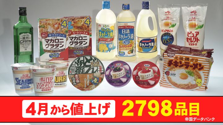 4月に値上げされる商品は、帝国データバンクによりますと、2798品目に及びます。日清食品の「カップヌードル」や「チキンラーメン」、味の素の「ピュアセレクトマヨネーズ」など、食卓でおなじみのものも多くあります。