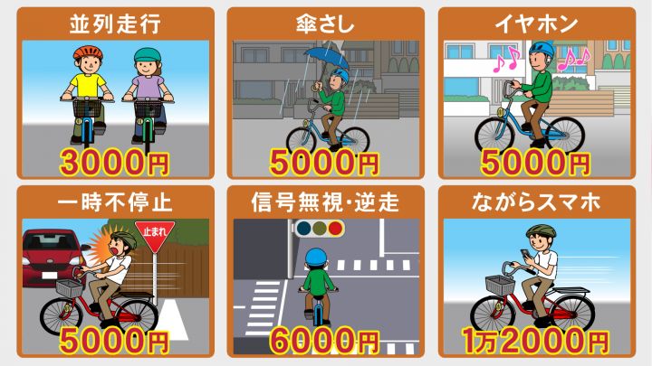 青切符は高校生を含む16歳以上が対象で、歩道通行や逆走、「ながら運転」などの違反に対し、最大で1万2000円の反則金が科されます。