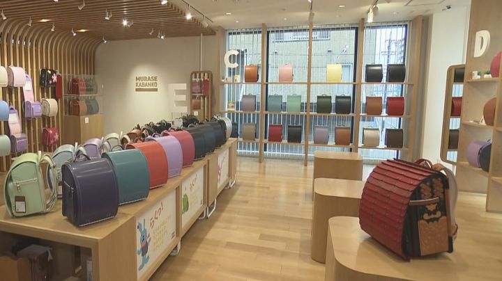 名古屋市中村区のランドセルメーカー「村瀬鞄行」。内側の仕切りをなくして荷物を入れやすく軽くしたモデルに、特注品の甲冑をイメージしたものなど、78種類のランドセルが並びます。
