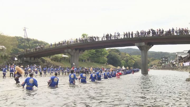 伊勢神宮の神域を流れる五十鈴川で、法被姿の市民たちが引っ張っているのは、長さ6mの大きなヒノキです。