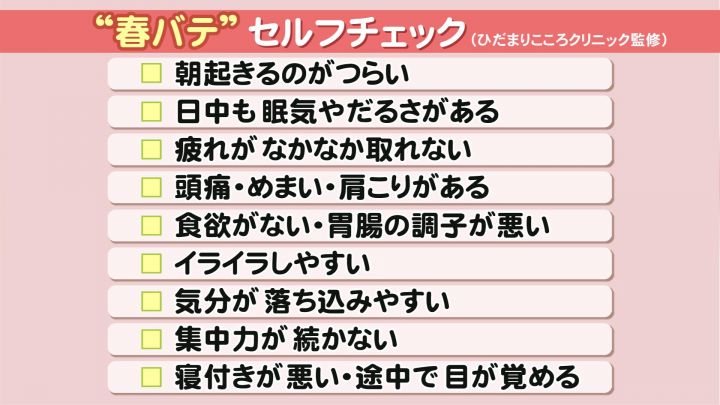 「この時期に多く、やる気が出なかったり、疲れが取れなかったり。あとは身体の不調ですね、頭痛が出たり、寝られなかったり。そういった症状が出ることを『春バテ』と言っています」