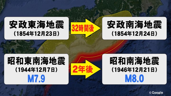 1944年にマグニチュード7.9を観測した昭和東南海地震の2年後にも、マグニチュード8.0の昭和南海地震が発生しています。