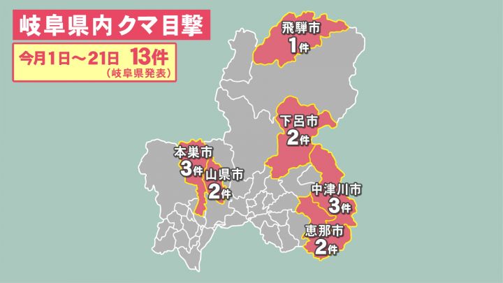 クマの目撃件数は、岐阜県によりますと、4月は21日までに中津川市と本巣市で3件など、県内で13件ありました。