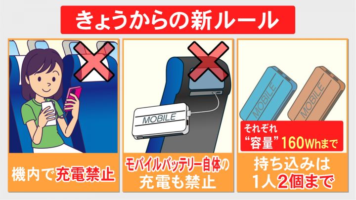 航空機内でのモバイルバッテリーによるスマホなどへの充電や、モバイルバッテリー自体に充電することが禁止になったほか、機内への持ち込みも1人2個(160Wh以下のもの)となります。