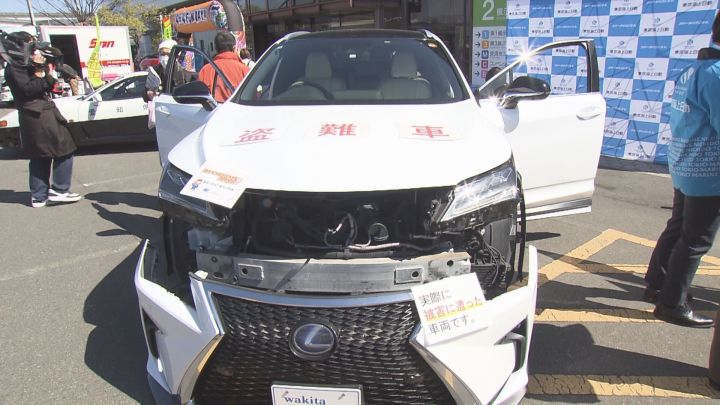 会場の一角に展示されていた、痛々しく壊れたレクサスRX。愛知県内で盗まれ、警察から追跡を受ける途中に事故を起こした車で、特に自動車盗の被害が多いSUVのオーナーに、注意を呼び掛けるために展示されていた。