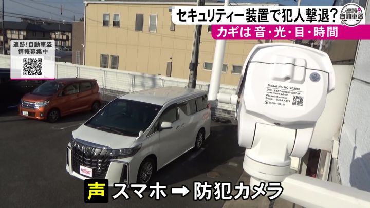 一方、光や音と並んで犯人が嫌がる「目」の対策も。愛車を監視する防犯カメラの映像をスマホで確認でき、不審者がいれば声で威嚇もできるシステムだ。スマートフォンに向かって声を発すると、離れた場所にある防犯カメラにその声が届くようになっている。