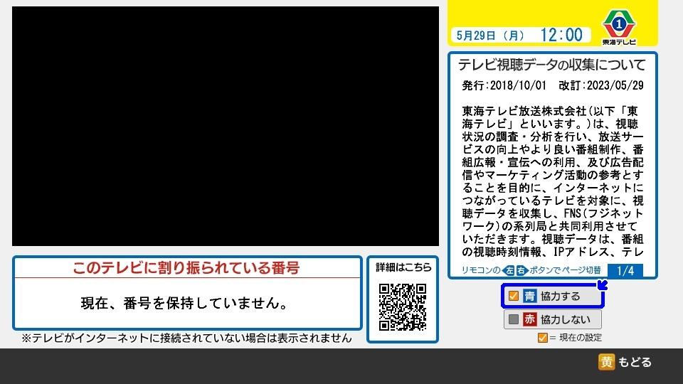 テレビ利用状況調査に「協力しない」ボタンを押すと、データの送信は停止します。