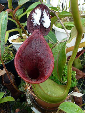 主に東南アジアの熱帯地方に広く分布するツボのような形をした食虫植物。 虫にとって魅力的な物質を出し、袋の中に誘い込み捕食する。