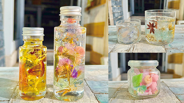 豊富なドライフラワーの中からお好きなものを選び、瓶に詰めていただき、ハーバリウムやキャンドルホルダー、またアロマオイルをたっぷり使用した色鮮やかなアロマキャンドルもお作りいただけます。どれも追加料金なしで、小さなお子様からご参加いただけます。