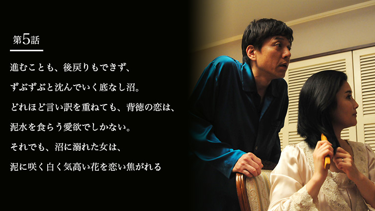 - 進むことも、後戻りもできず、ずぶずぶと沈んでいく底なし沼。どれほど言い訳を重ねても、背徳の恋は、泥水を食らう愛欲でしかない。それでも、沼に溺れた女は、泥に咲く白く気高い花を恋い焦がれる