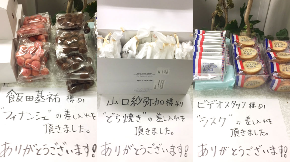 写真は差し入れのお菓子。現場にはいつもたくさんの差し入れがあります。(これはほんの一部です)